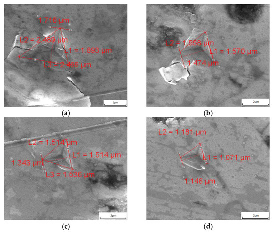 The nanoindentation method was used to test the modulus and hardness with a nanomechanical testing system (Hysitron TI Premier, Bruker, MN, USA). The prismatic indenter was used with a load of 10 mN for the loading time, holding time, and unloading time of 5 s, 3 s, and 5 s, respectively. When the low-load indentation test is used, radial cracks can be obtained. The cracks produced in this experiment are all radial cracks, and the crack length calculation method is adopted. The relationship between fracture toughness and crack length is shown in Formula (2):