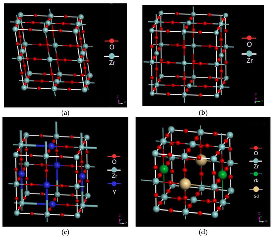Crystalline structures of the ceramic: (a) M-ZrO2; (b) T-ZrO2; (c) T-8YSZ; (d) T-GYYZO.