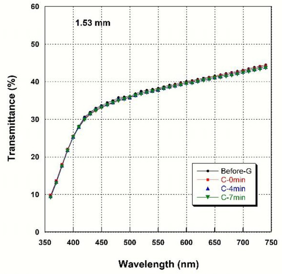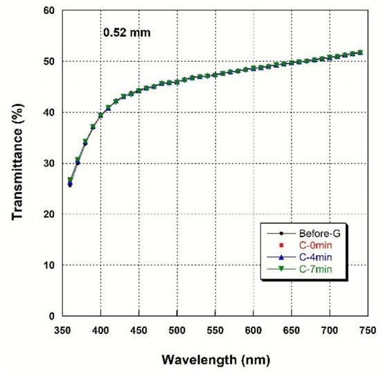 Figure 2, Figure 3, Figure 4 and Figure 5 show spectral transmittance according to cooling rate during glazing for specimens of various thicknesses. All groups showed similar spectral transmittance data at various thicknesses. The spectral transmittance values decreased as the thickness increase at all measured wavelengths. In addition, the transmittance gradually decreased as the wavelength decreased for all groups. In particular, the transmittance decreased sharply from 420 nm with decreasing wavelength. Table 4 shows the AT as a function of cooling rate for specimens of various thicknesses. The statistical analysis (Table 4) results show that there is no significant difference in AT according to cooling rate during glazing, and there is no interaction between thickness and cooling rate (p > 0.05). Significant differences in AT with thickness were found for all groups. AT decreased from approximately 46% to 32% with increasing thickness (from 0.52 mm to 2.02 mm) (p < 0.001).