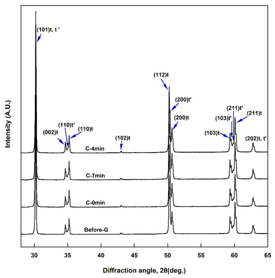 Figure 6 shows the XRD pattern of each specimen. The lattice constant and Miller index of tetragonal zirconia can be described by a face-centered tetragonal lattice, but in this study, it was described as a more general body-centered tetragonal lattice [37]. No cubic phase or monoclinic phase was observed in any of the specimens; only the tetragonal (t) phase was observed. The metastable tetragonal (t′) phase, which has an axial ratio (c/a ratio = c/√2a) closer to one, was also observed to coexists with the t phase. The crystal structure was not observed to change with cooling rate during glazing. The lattice constants of the t phase determined in this study are a = 3.602 Å and c = 5.172 Å, and the lattice constants of the t′ phase are a = 3.624 Å and c = 5.159 Å.