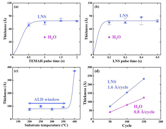 Thickness of HfOx films grown using LNS as a function of (a) TEMAH pulse time, (b) LNS pulse time, (c) substrate temperature, and (d) ALD cycle. Data for films grown using H2O is shown in purple for comparison in (a,b,d). The growth rates were 1.6 Å per cycle for the process involving LNS and 0.8 Å per cycle for that involving H2O.