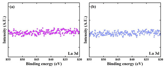 The widely reported crystalline phase of HfOx films is monoclinic. However, the doping of metal element into HfOx makes the film orthorhombic phase, showing ferroelectric characteristic. Therefore, to verify the presence or absence of La in the composition of the films, addition XPS data was analyzed. In general, in the XPS analysis for La, spin–orbit peaks of La 3d5/2 and La 3d3/2 appeared near 835 eV and 850 eV, respectively, and each spin–orbit component was further split via multiplet splitting [20]. However, the XPS data in Figure 6 only show background signals. It indicated that the La content was lower than the detection limit of our XPS analysis method. Thus, the results indicated that the La in the LNS oxidant hardly had very little influence on the chemical composition of the deposited HfOx films. The XRD results indicate that the HfOx existed in the monoclinic phase in the films, and the XPS results show that the La content was below the detection limit. Thus, we conclude that La in LNS is not affected by the chemical reaction with TEMAH, as observed for a ZrO2 film prepared using LNS [10]. As a consequence, it can also be concluded that the HfOx deposited using LNS is probably not ferroelectric.