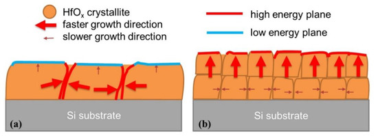 Finally, we present an explanation for the correlation between the surface energy, growth rate, and crystalline characteristics of the HfOx films. The proposed possible growth mechanisms for the HfOx films are shown in Figure 7.