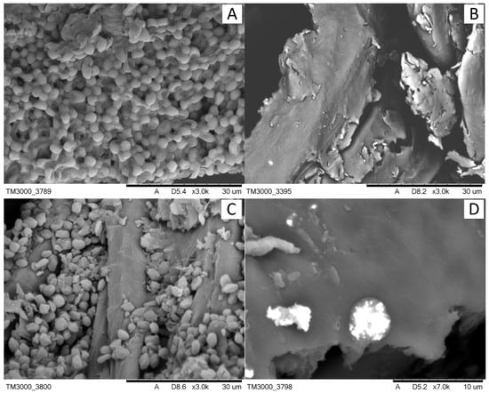 SEM microphotography: (A) SC, (B) RA, (C) RA-SC, (D) RA-SC-Pb.
