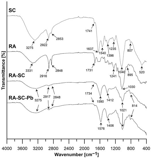 The performed analysis of FTIR SC, RA, RA-SC and RA-SC-Pb is shown in Figure 2. The analysis showed a difference in the chemical structure, the nature of bonds and interactions between the materials. Differences in frequency and intensity of the bands are observed, especially in the case of SC and other materials. The most intense broad band in the range of 2990–3600 cm−1 corresponds to the stretching vibrations of the hydroxyl groups -OH [41], in the range 2916–2922 cm−1 there are νasym CH2 (a large change in intensity and a shift of the peak in RA-SC can be observed before and after sorption in relation to SC and RA) and in the range of 2848 and 2853 cm−1 νsym CH2 (there is a change in the intensity of the peak in RA-SC before and after sorption against SC and RA) [42,43]; bands related to C–O bonding, C–N axial deformation, and primary amine bending NH2 were observed at 1637 cm−1 [44], stretching vibrations in lipid esters (-C=O) exist at the wavenumber 1734 cm−1 (shifted from 1741 cm−1 SC and 1731 cm−1 RA), the strong peak at 1040–1021 cm−1 corresponds to C–O stretching caused by glycosidic bonding, OH groups in sugars, or C–O–C stretching vibrations in lignin or hemicellulose, the δ C–H bonding of the aromatic ring, S=O stretching, 1060–1020 cm−1 [45,46,47]. Moreover, the relative intensity of the 1021 cm−1 band increases after the RA-SC-Pb adsorption process compared to RA-SC. Meanwhile, the absorption peak of -NH2 stretching shifted from 1396 to 1412 cm−1, and after sorption to 1406 cm−1, indicating that the amine group was involved in coordination with Pb(II), leading to an increase in the -NH2 bond length in the SC. The 1235 cm−1 peak is responsible for C=O vibrations [48], the anti-symmetric phosphate stretching band around 1241 cm−1 should therefore not be considered for estimation of lipid content [49]; the N–H and C–N vibrations of the peptide bond in different protein conformations 1590–1540 cm−1 (there is a shift of the peak maximum Δ = 14 cm−1 after the Pb(II) sorption, indicating that nitrogen atoms are the adsorption sites for Pb(II) adsorption on RA-SC) [42,50]; 895–807 cm−1 represents the presence of sugars, mainly monosaccharides [51]; in the 600–400 cm−1 band, vibrations occur due to CNC deformation [52].