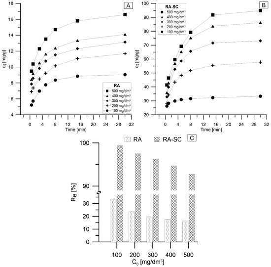 The sorption capacity in time depending on the initial concentration: (A) RA, (B) RA-SC, (C) the degree of metal removal from the RA and RA-SC model solutions (T = 25 °C, pH = 5).