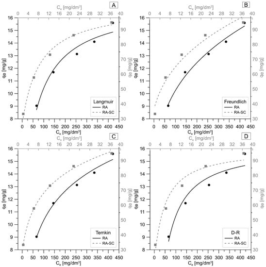 Graphic representation of sorption isotherms RA and RA-SC: (A) Langmuir, (B) Freundlich, (C) Temkin, (D) D-R (T = 25 °C, pH = 5).