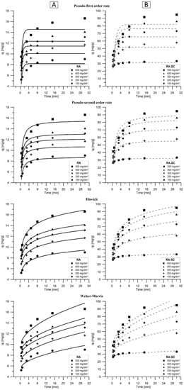 Graphic representation of pseudo-first-order, pseudo-second-order, Elovich and Weber–Morris models for the process of ions adsorption: (A) RA, (B) RA-SC (T = 25°C, pH = 5).