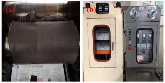 (a) the preparation process of various MPU/EUG composites by using an open mill; (b) the vulcanizing instrument used in this work.