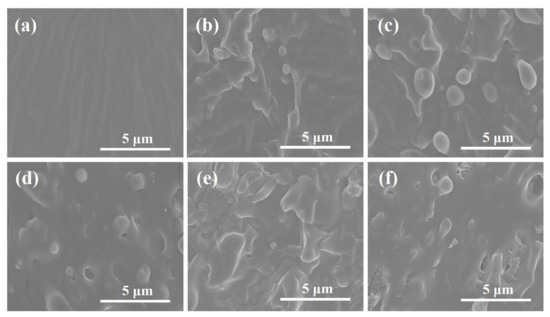 SEM was utilized to explore the effect of EUG content on the microstructure of the MPU matrix. Various MPU/EUG composites with the ratio of 100/0, 90/10, 80/20, 70/30, 60/40 and 50/50 are shown in Figure 3a–f, respectively. As can be seen from Figure 3a, the fracture morphology of pure MPU was smooth and flat, and the molecular chain orientation caused by the stress during the composite preparation can also be observed in Figure 3a. With the addition of EUG content, the fracture morphology of various MPU/EUG composites became increasingly rough, and some larger particles appeared gradually, which was actually the crystalline regions of the EUG matrix [27,28]. In the matrix of various MPU/EUG composites, MPU is mainly cross-linked with EUG by the double bonds in its side chains and the number of crosslink sites was relatively low. As a result, uncross-linked EUG crystallized in the MPU/EUG matrix [10]. Meanwhile, the presence of side chains enhanced the polarity of MPU, which deteriorated the compatibility of MPU and EUG in the MPU/EUG matrix. With an increase in EUG content, therefore, cracks and the voids (caused by EUG crystallization shedding) increased gradually on the microstructure of various MPU/EUG composites.