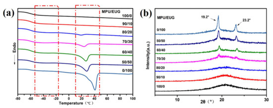 DSC and XRD curves of various MPU/EUG composites. (a) DSC curves; (b) XRD curves.