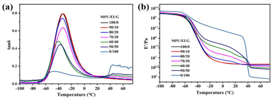 The tanδ-T and E’-T curves of various MPU/EUG composites. (a) tanδ-T curves; (b) E’-T curves.