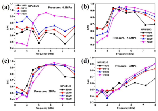 Figure 6 displays the sound absorption coefficient curves of various MPU/EUG composites under different pressures. As shown in Figure 6, the sound absorption data is quite chaotic in the frequency range of 3–4.5 kHz, which might be caused by the instability of the instrument in this frequency domain. In the frequency range of 4.5–8 kHz, the sound absorption coefficient of various MPU/EUG composites increased gradually with the addition of EUG, and the more EUG added into MPU, the more obvious the sound absorption coefficient improved. There are two reasons that account for the above phenomenon. On the one hand, the small EUG crystals in MPU matrix could diffuse the sound waves incident into various MPU/EUG composites, changing the propagation path of sound waves and dissipating more acoustic energy [15,41,42,43]. On the other hand, the addition of EUG sharply improved the modulus of various MPU/EUG composites because of the high modulus of EUG, accelerating the propagation speeds of sound waves in the composites and achieving impedance matching with water [44,45], thus improving the sound absorption performance of various MPU/EUG composites.