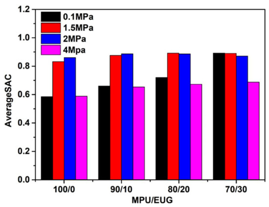 The average sound absorption coefficients of various MPU/EUG composites in the frequency range of 4.5–8 kHz were calculated and are displayed in Figure 7. Figure 7 shows how the sound absorption coefficient of all MPU/EUG composites increased first and then decreased with the increase in pressure. Under the pressures of 1.5 MPa and 2 MPa, all MPU/EUG composites exhibited relatively good sound absorption performances. Furthermore, adding EUG into MPU enhanced the sound absorption performances of various MPU/EUG composites. It should be noted that compared with that of pure MPU, the sound absorption coefficient of the MPU/EUG (70/30) composite increased 52.2% at a pressure of 0.1 MPa and 16.8% at a pressure of 4 MPa. The results indicate that EUG significantly improved the sound absorption performances of MPU/EUG composites and that the MPU/EUG (70/30) composite showed the best sound absorption performance in all MPU/EUG composites under both low and high pressures.