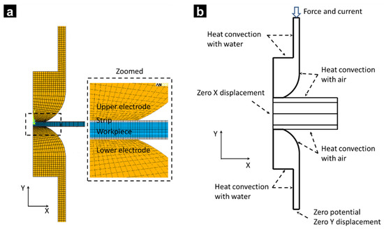 FEM was conducted using the module of Mechanical APDL in ANSYS 15.0. Considering the symmetry of RSW system, the FEM model was simplified to a 2D axial symmetric one. As shown in Figure 1a, four-node elements were used to model the electrode, strips, and steel sheets. Contact elements were inserted between the electrode/strip, strip/sheet, and sheet/sheet interfaces to model the contact phenomenon at interfaces. The mesh size was smaller at the center of weld zone, as shown in the enlarged area of Figure 1a.