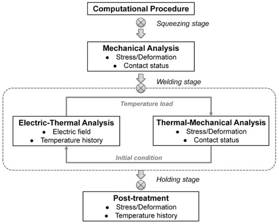 The computational procedure is shown in Figure 2. At the squeezing stage, only mechanical analysis was conducted to calculate the contact status and stress distributions. Due to the difficulty of direct coupling of the electric-thermal-mechanical field, the coupled analysis of the welding stage was conducted in electric-thermal analysis and thermal-mechanical. The heat transfer result obtained from the electric-thermal analysis was applied as thermal load for the thermal-mechanical analysis, and the contact status of the thermal-mechanical was used as initial conditions for the next iteration of electric-thermal analysis. The electric-thermal analysis and thermal-mechanical iterated every 5 ms and the temperature of the contact elements was checked every 5 ms as well; once it exceeded the melting point, the corresponding contact element was disabled.