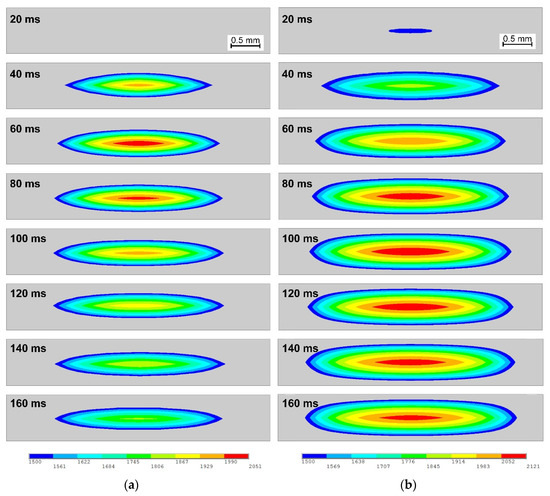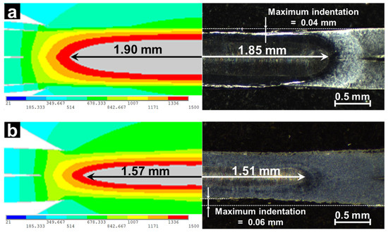 As shown in Figure 4a, the weld grew to 2.3 mm in diameter and 0.33 mm in depth after only 40 ms, and it kept growing to about 3.1 mm in diameter and 0.38 mm in diameter at 80 ms. However, the weld remained virtually unchanged from 80 ms to 160 ms. Referring to Figure 4b, the weld initiated within only 20 ms with inserted 0.10 mm thick AISI304 strip, earlier than in traditional RSW. Moreover, the weld increased considerably in both diameter and depth direction, and the shape of the weld changed. The calculated weld using inserted strip is about 3.8 mm in diameter and 0.63 mm. Compared to the weld produced by traditional RSW, the weld increased about 23% in diameter and 65% in depth by making use of the inserted strips. The more significant increase in weld depth could be related to the comparatively lower thermal conductivity of the strip material (i.e., stainless steel).
