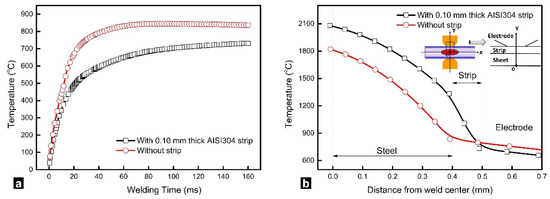 Comparison of (a) time-dependent electrode tip temperature and (b) temperature distribution of the symmetrical axis at the final moment of welding stage without strip and with a 0.10 mm AISI304 strip [4]. Reprinted with permission.