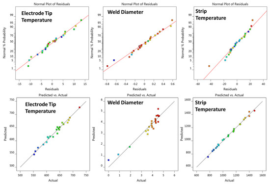 ANOVA results for the regression model of electrode tip temperature, weld diameter, and strip temperature are listed in Table A4, Table A5 and Table A6, respectively.