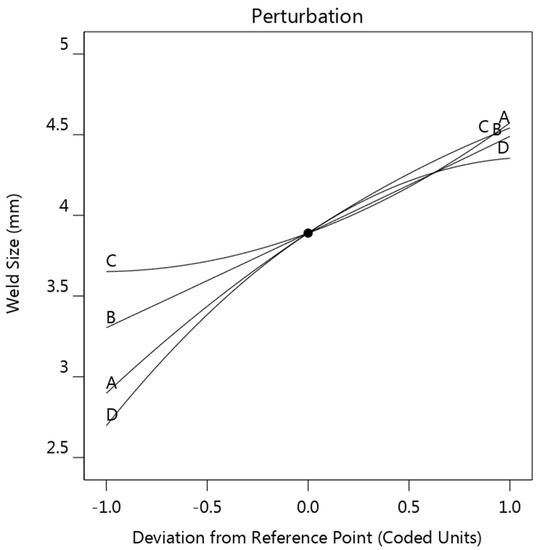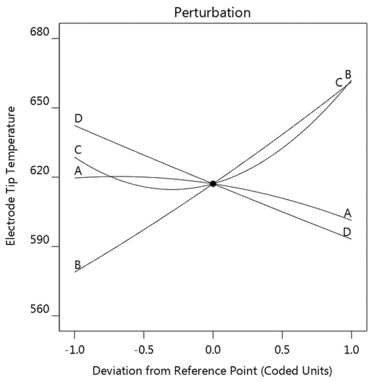 A perturbation plot was employed to visually display the influence of the concerned parameters on the electrode tip temperature, as shown in Figure 8. This figure shows how the response varied with each factor while all other factors kept constant at 0 level. A steeper slope or curvature in a factor indicates that the response was more sensitive to that factor.