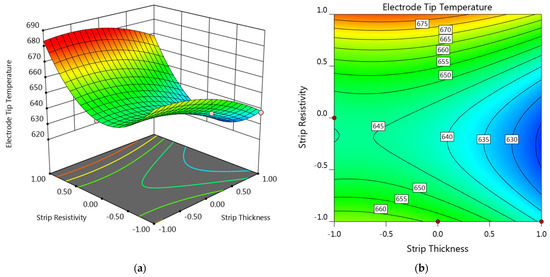 Response surface and contour plot showing the strip thickness and strip resistivity on the electrode tip temperature are provided in Figure 9. The welding current was set as center level, while the sheet thickness was set as −1 level (equals to 0.4 mm). It can be seen that the electrode tip temperature at the left half was comparatively higher than the right half while the upper half was higher than the lower half. As shown in Figure 9, the electrode tip temperature was comparatively lower in the lower right section of the plots, which suggested that strips with comparatively higher thickness and lower resistivity would be more preferable for reducing the electrode tip temperature.