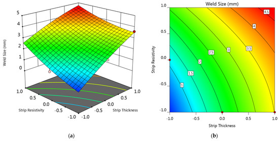 Response surface and contour plots of the interaction effects of strip thickness and strip resistivity on the weld diameter are provided in Figure 11. As can be seen, the smallest weld diameter occurred at (−1, −1), while the biggest weld diameter was obtained at (+1, +1). Overall, the response surface showed an increasing tendency along the diagonal from (−1, −1) to (+1, +1). Considering that the minimum acceptable weld diameter of 0.4 mm steel is 2.5 mm, it can be found that only the upper triangle part of the plot was qualified. This result suggested that a suitable strip should possess enough bulk resistance in order to maintain a qualified weld diameter. Strips with minus level of both strip thickness and strip resistivity were not qualified.