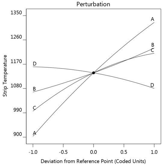 The strip temperature model was analyzed using a similar strategy; the perturbation plot is provided in Figure 12. As shown, the effect of each factor in strip temperature, sorting from most influential to least, is strip thickness A > strip resistivity C > welding current B > A sheet thickness D. Strip thickness, strip resistivity, and welding current exhibited a promoting effect on strip temperature, while the sheet thickness showed a slightly negative effect.