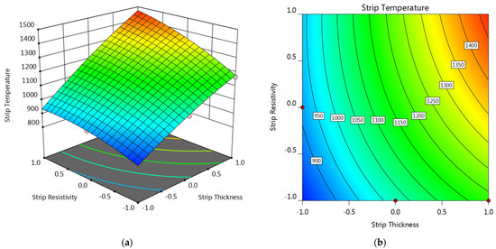 (a) Response surface and (b) contour plot showing the effect of factor A and C on the strip temperature at B = 0 and D = −1.