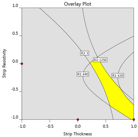 Based on the aforementioned results, it can be seen that any improvement in one response usually resulted in deterioration of other responses. Hence, all three responses should be studied together. An optimization study is needed to find out the optimal strip to achieve a desirable electrode life and meanwhile a desirable weld diameter. Rather than identifying the very optimal strip, it would be of greater practical significance to figure out the process window for selecting a suitable strip for a specific steel sheet. Figure 14 shows the overlay plot of the feasible strip properties for a 0.4 mm thick steel sheet. The criteria for the three responses are that the electrode tip temperature should be lower than 640 °C, weld diameter bigger than the minimum acceptable one (i.e., 3.0 mm for a 0.4 mm thick steel sheet), and the strip temperature lower than 1250 °C. The areas highlighted in yellow on the overlay plots indicated the strip properties that met the aforementioned criteria.