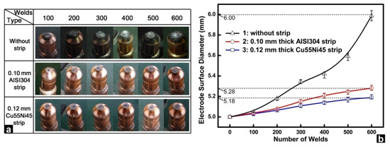 Figure 15 shows the electrode profiles and the growth of electrode face diameters using different strips. In RSW without strips, a rough silvery layer could be observed on the electrode surface and the electrode surface was far smoother with inserted strips. Moreover, the growth rate of the electrode surface diameter was far slower by making use of inserted strips, especially the optimized 0.12 mm Cu55Ni44 strip.