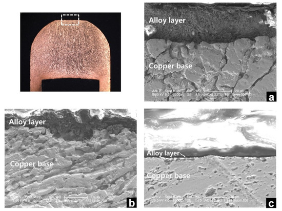 Figure 16 shows the cross-sections of the electrodes used after 600 welds. As shown in Figure 16, a thin layer of surface alloying could be observed on the three electrodes. The thickness of the thin layer differed widely. Without inserted strips, the thickness of the alloy layer was about 30 μm. It decreased to 6 μm by using 0.1 mm thick AISI304 strip and to 2 μm by using the optimal strip. The decrease in the thickness of the alloying layers implied a smaller extent of surface alloying occurring at the electrode surface and a lower temperature developed at the electrode surface, and the 0.12 mm Cu55Ni45 strip showed a better effect, which confirmed the validity of the optimization.