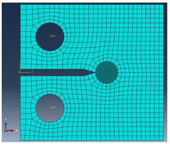 Extensive elastic-creep FE analyses for welded CT specimens were performed in this study. The general purpose FE program ABAQUS (2016, Dassault Systemes Simulia Corp., Johnston, RI, USA) [20] was used to calculate the C* integral. A seam crack is included in a 2D CT specimen model. The selected crack front is equivalent to the crack tip. The direction of crack propagation at the crack tip is defined using the virtual crack extension direction. A small geometry change continuum FE model was applied. In order to avoid problems associated with incompressibility, 8 node reduced integration elements for 2D plain-strain problems (CPE8R) were used [3]. The elements of innermost ring at the crack tip are degenerated into triangles. The three nodes along one side of the eight-node element are defined so that they share the same geometrical place. Each of the three collapsed nodes can be displaced independently [21]. Figure 2 shows a typical FE mesh for the CT specimen a/W = 0.5 and W/h = 6. The crack-tip zone is meshed finely. The mesh size at crack-tip region is selected so as to eliminate mesh-sensitivity in determining the stress fields and C* integral. Therefore, the element size selected in all further analyses was 0.05 mm.