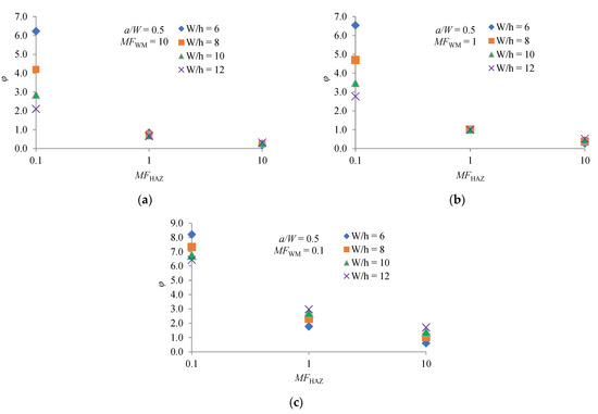 Dependence φ factor on MFHAZ, MFWM and W/h for a/W = 0.5: (a) MFWM = 10; (b) MFWM = 1; (c) MFWM = 0.1.