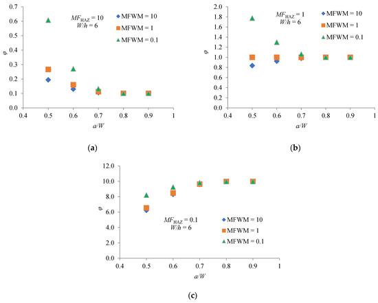 Dependence φ factor on MFHAZ, MFWM and a/W for W/h = 6: (a) MFHAZ = 10; (b) MFHAZ = 1; (c) MFHAZ = 0.1.