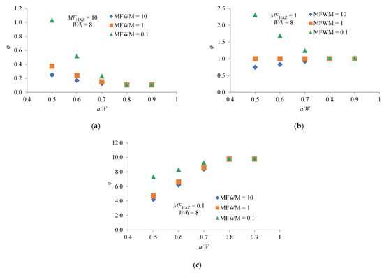 Dependence φ factor on MFHAZ, MFWM and a/W for W/h = 8: (a) MFHAZ = 10; (b) MFHAZ = 1; (c) MFHAZ = 0.1.