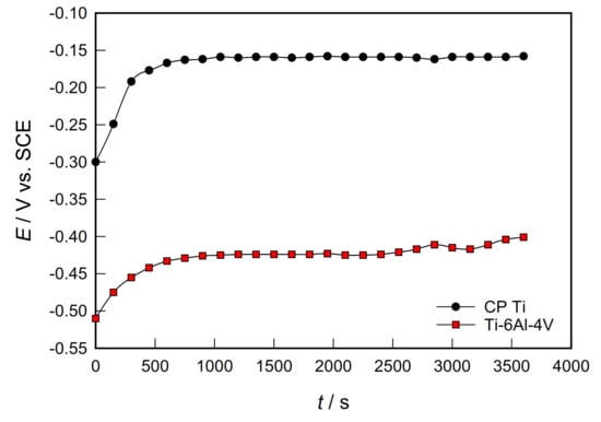 Figure 1 presents the evolution of the EOC as a function of time for CP Ti and Ti-6Al-4V samples in PBS solution at 37 °C. EOC reflects the composite results of the electrochemical reactions taking place at the electrode/solution interface.