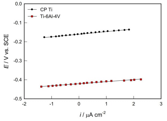 Linear parts of polarization curves for CP Ti and Ti-6Al-4V alloy in PBS solution.