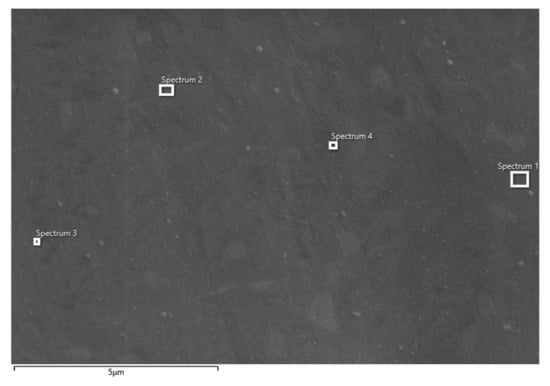 After potentiodynamic polarization measurements, the surface condition of CP Ti and Ti-6Al-4V samples was examined by SEM, while the elemental composition of the surface at individual positions was determined by EDS analysis. The obtained results are shown in Figure 4 and Table 3.