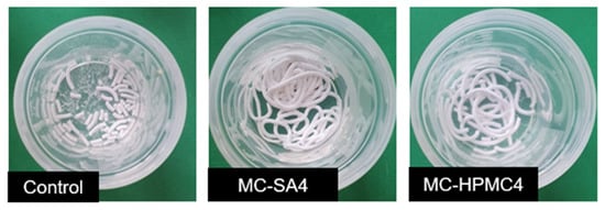 Obtained materials: Control, MC-SA4 and MC-HPMC4 immediately after extrusion from the syringe to SBF.