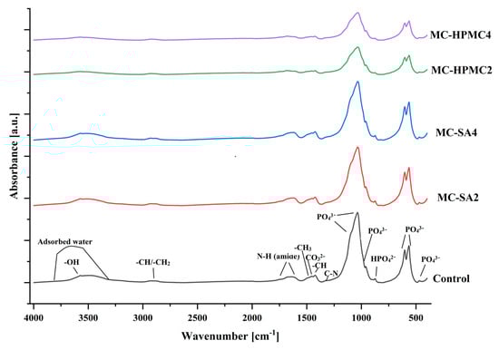 FT-IR spectra of obtained biomicroconcretes: Control, MC-SA2, MC-SA4, MC-HPMC2, and MC-HPMC4.
