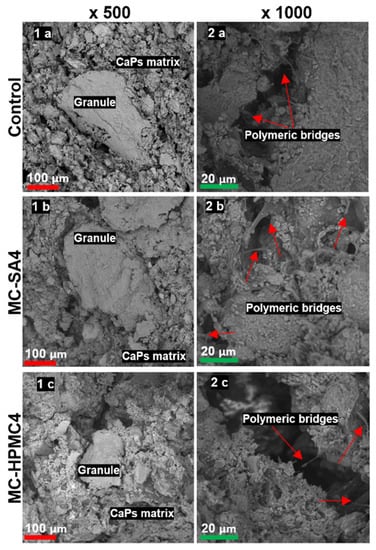 SEM observations of the obtained composites after seven days of drying in air revealed that the materials possessed compact, homogenous microstructure formed by hybrid hydroxyapatite-chitosan granules and a cementitious matrix with visible micropores. The microstructure of hybrid HAp-CTS granules and biomicroconcretes was composed of calcium phosphates (CaPs) agglomerated matrix (Figure 3(1a–1c)) and polymers. The polymers present in developed materials were observed in the form of a polymeric film adhering to the calcium phosphate grains as well as polymeric bridges between the granules (Figure 3(2a–2c)). Characteristic polymeric bridges between granules and pectin present in the matrix were observed by others. For example, Zima et al. [33] developed hybrid HAp/CTS granules, while Mickiewicz et al. [48] added various water-soluble polymers to commercial calcium phosphate bone substitutes. The presence of numerous characteristic chitosan bridges is evidence of the interactions among hybrid HAp/CTS materials, citrus pectin, and probably polymeric additives [13,24]. Similar microstructures were observed previously by Czechowska et al. [32] where the addition of chitosan to the liquid phase of α-TCP-based bone cements was investigated.