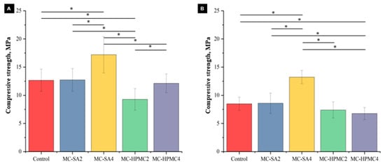 Compressive strength of biomicroconcretes after 7 days of drying in air (A) and after 7 days of incubation in SBF (B) (*—statistically significant difference, p < 0.05).