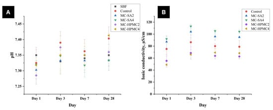 Chemical stability studies are one of the important tests for considering implantable materials for medical applications. Incubating the sample in SBF is considered as a first step for evaluating material characteristics and understanding their degradation mechanisms [54]. In order to evaluate chemical stability and bioactivity in vitro of the obtained biomicroconcretes, materials samples were incubated in simulated body fluid. Figure 6A shows the pH changes of SBF during the immersion of the samples. The pH changes of SBF remained close to the physiological values and ranged from 7.22 to 7.41. The addition of polysaccharides in the form of sodium alginate (MC-SA2 and MC-SA4) or hydroxypropyl methylcellulose (MC-HPMC2and MC-HPMC4) only slightly influenced the solution’s pH values. Similar pH values of incubated CPCs were observed elsewhere [32,55]. Ionic conductivity during the incubation in distilled water of the control material was in the range of ~75–87 μS/cm. An additive in the form of sodium alginate (materials MC-SA2 and MC-SA4) caused an increase in ionic conductivity (~87–113 μS/cm), whereas for HPMC (materials MC-HPMC2 and MC-HPMC4), a decrease of ionic conductivity to ~49–69 μS/cm was observed (Figure 6B). This phenomenon can be explained by a higher degradation rate of SA than HPMC in aqueous solutions [18,56,57]. Ionic conductivity of all the obtained materials reached a plateau after seven days of incubation in distilled water.
