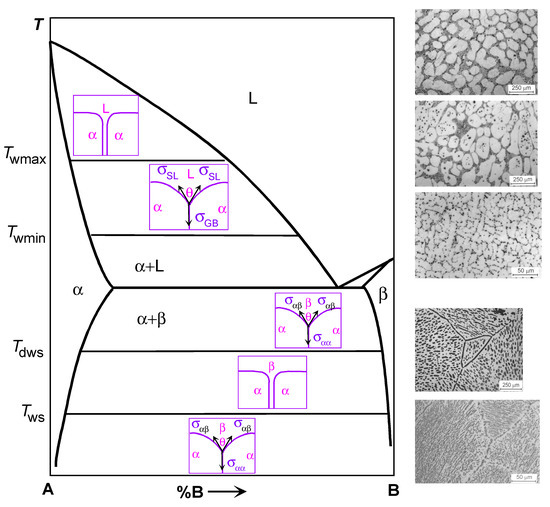 In the schematic Figure 1, in the two-phase region α + β, these tie-lines are shown for wetting at Tws and for the dewetting at Tdws. It should be noted here that such a scheme is very simplified. We saw above, when discussing the liquid-phase wetting, that all grain boundaries in a polycrystal have different energies σGB, and for each value of σGB energy there is its own value of the wetting phase transition temperature Tw. This means that, in reality, the tie-lines at Tws and Tdws should split into a spectrum of lines, and one should draw not one line for each temperature, but at least two lines for the maximum Twsmax, Tdwsmax and minimum Twsmin, Tdwsmin values of Tw.