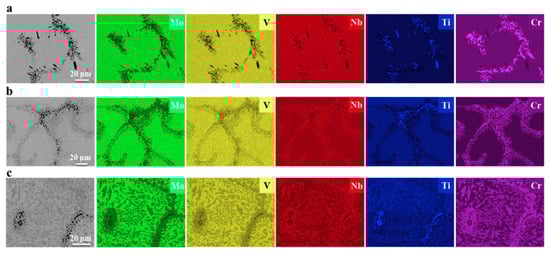 SEM/EDS mappings of Mo, V, Nb, Ti and Cr in the annealed (a) Cr1.0, (b) Cr1.5 and (c) Cr2.0 alloys. Reprinted with permission from Ref. [26]. Copyright 2020 Elsevier.