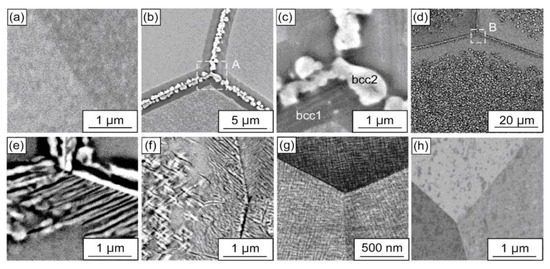 In the case of the equiatomic HfNbTaTiZr high entropy alloy prepared by the plasma arc melting the two-phase S + L area of the phase diagram does not contain any tie-lines of the GB wetting transition and the one-phase solid solution polycrystal with typical dendritic structure forms after solidification [5]. After homogenization at 1473 K, this dendritic structure disappears and the bcc solid solution becomes homogenous (Figure 7a). The following anneals show that at 1173 K the HfNbTaTiZr HEA is still a single phase. However, at 1073 K the first precipitates of the second phase bcc-2 appear. They form almost continuous 500–900 nm thick layers along the GBs in the bcc-1 matrix (Figure 7b,c). It means that the second solid phase bcc-2 completely wets the GBs in the bcc-1 matrix phase. At 973, 873 and 773 K the third phase with hcp structure appears in the XRD patterns. The bcc-2 and hcp phases also completely wet the GBs in the bcc-1 matrix at 973 and 873 K (Figure 7d–f). At 773 K the bcc-2 and hcp phases are present in XRD patterns, but they do not form the continuous GB layers and are present only in the bulk (Figure 7g). It means that between 873 and 773 K the dewetting of the GBs of the bcc-1 phase takes place. At 673 K the bcc-2 and hcp phases completely disappear from XRD patterns and are absent both in the bulk and at the GBs Figure 7h). Thus, the GBs in the bcc-1 phase are completely wetted by the second solid phase(s) only in the certain temperature interval between 773 and1073 K. This phenomenon is similar to wetting and dewetting of GBs in (Cu) solid solution by the solid δ-phase in the Cu–In alloys.
