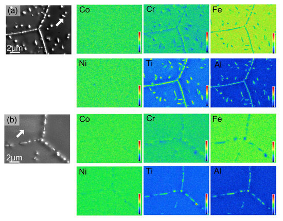 The HEAs Co35Cr25Fe40-xNix (x = 5 and 14 at. %, named as Ni5 and Ni14) and (Co35Cr25Fe40-x Nix)94Ti3Al3 (x = 5 and 14 at. %, named as Ni5-TA and Ni14-TA) were prepared by arc-melting mixtures of the constituent elements [66]. The as-cast ingots were homogenized at 1200 °C for 4 h, and then cold rolled. Afterward, the samples were annealed at 1150 °C for 5 min and quenched in water. After this homogenization, the specimens have been aged at 700, 800, 900 and 1000 °C between 1 h and 16 h with the following water quenching. This complicated experimental procedure implies to us that the thermodynamic equilibrium was reached at 700, 800, 900 and 1000 °C. XRD shows that the samples consist of an fcc matrix and a small amount of hcp phase. SEM demonstrates that the hcp phase is distributed mainly in fcc/fcc GBs (Figure 8). In the (Co35Cr25Fe40-x Nix)94Ti3Al3 with x = 5 alloy the hcp phase forms the particle chains (incomplete wetting) at 700 °C (Figure 8a) and 800 °C (Figure 8b). At 900 and 1000 °C appear the matrix GB completely “wetted” by the hcp phase (Figure 8c,d). The alloys (Co35Cr25Fe40-x Nix)94Ti3Al3 with x = 14 behave differently. At 700, 800 and 900 °C we observe only the chains of precipitates in GBs and, therefore, the partial GB wetting (Figure 8e–g). At 1000 °C the second phase with hcp lattice is completely absent both in bulk and in GBs (Figure 8h). The elemental mapping shows that the GB wetting phase is enriched by Ti and Al (Figure 9). Thus, here we also can see that the change of HEA composition modifies the conditions for the GB wetting and, therefore, the morphology of GB precipitates.