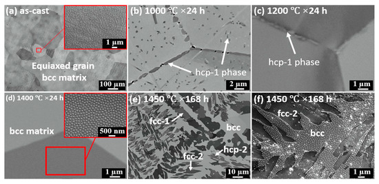 Microstructure evolution of HfNbTaTiZr RHEA at various conditions: (a) as-cast; (b) 1000 °C, 24 h; (c) 1200 °C, 24 h; (d) 1400 °C, 24 h; (e) 1450 °C, 168 h; (f) a magnified image of observed precipitates in condition of 1450 °C, 168 h. Reprinted with permission from Ref. [67]. Copyright 2019 Elsevier.