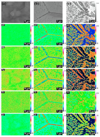 Elemental mapping at different conditions: (a) as-cast; (b) 1000 °C, 24 h; (c) 1450 °C, 168 h. Reprinted with permission from Ref. [67]. Copyright 2019 Elsevier.