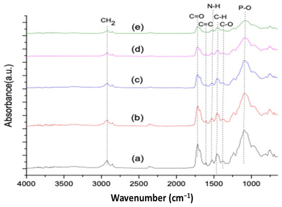 Comparative FTIR spectra of (a) EC-C, (b) EC-T1, (c) EC-T2, (d) EC-Z1, and (e) EC-Z2.